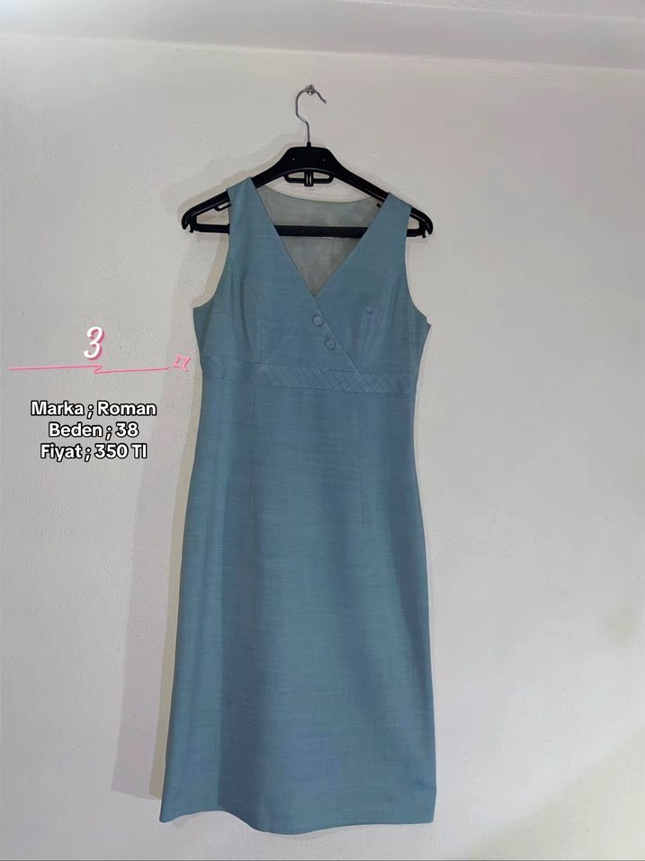 V yaka, düğmeli, mavi midi denim elbise. Regular fit, kolsuz ve ofis kullanımı için uygun. Marka: Roman, Beden: 38.