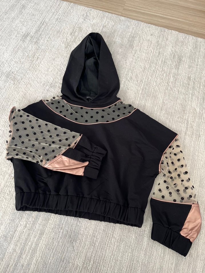 Siyah kapüşonlu sweatshirt, uzun kollu, puantiye desenli tül ve fırfır detaylara sahiptir. Salaş, kısa kesimiyle sokak modasına uygundur.