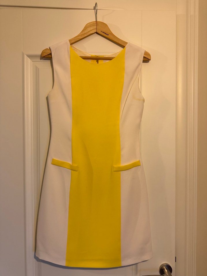 Sarı ve beyaz renklerde, kolsuz kısa elbise. Günlük kullanım için idealdir. Kolaltında kullanımdan dolayı leke var. Yıkanınca çıkacağını umuyorum.