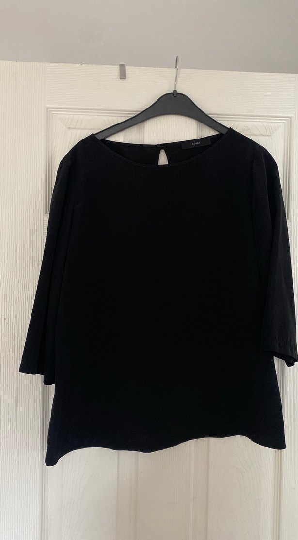 Siyah, saten kumaştan, yuvarlak yaka ve kol boyu fakir kollu, bol kesim bluz. Minimalist goth tarzında, ofis için uygun, zahmetsiz şıklık sunar. İki koltuk arası 52 santimdir kol boyu omuzdan 38 santimdir üründe hiçbir kusuru yoktur Solma yoktur tüylenme yoktur leke yoktur ürünü iadez yoktur