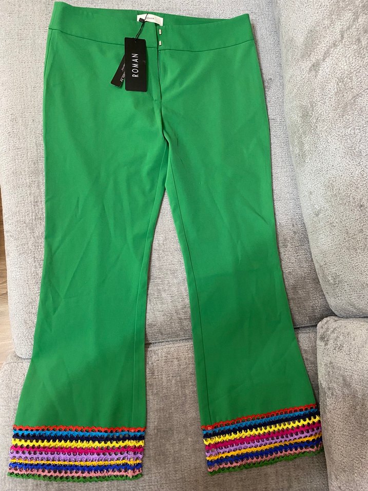 Yeşil renkli, normal kesim, kemerli kadın kumaş pantolon. Alt kısmı renkli nakışlarla süslü, sokak stili için uygun. Üzerinde "roman" etiketli.