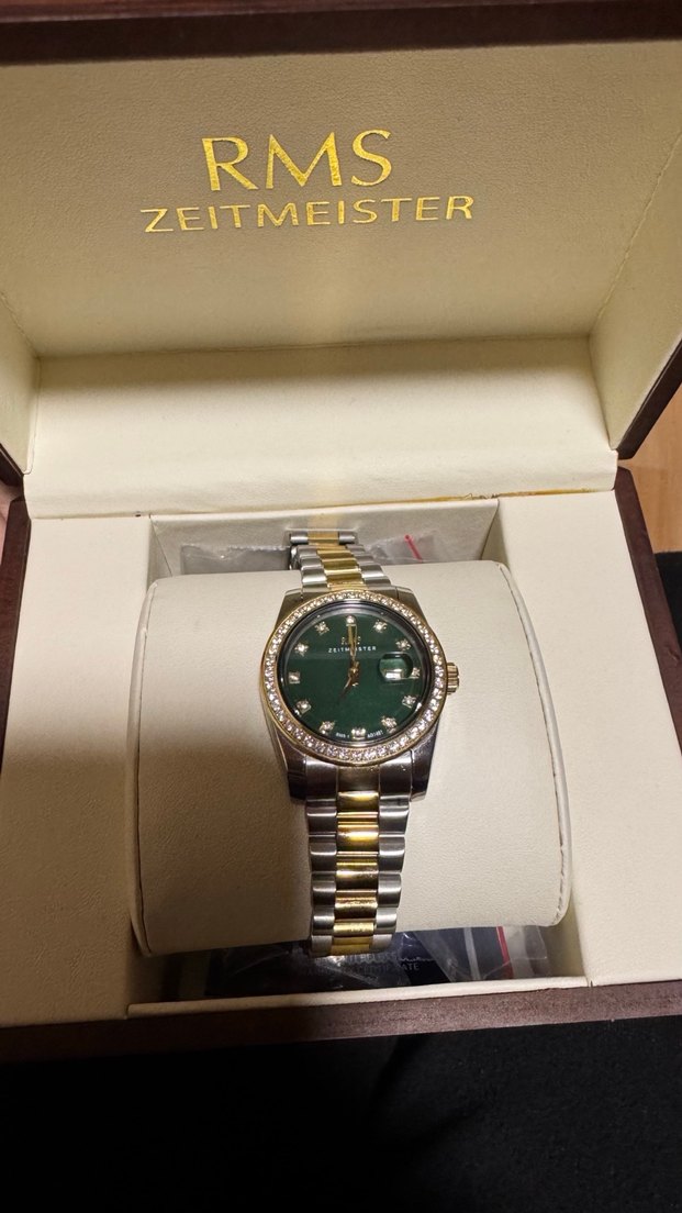 Bu kadın kol saati, yeşil kadranında kristal detaylarla süslü, parlak altın ve gümüş renkli kemerli bilekliğe sahiptir. Klasik zarafeti çağdaş tarzla buluşturur. ZEITMEISTER, RMS markalıdır. ⌚ uzatma parçasını da göndereceğim kendi koluma göre yaptırmıştım
