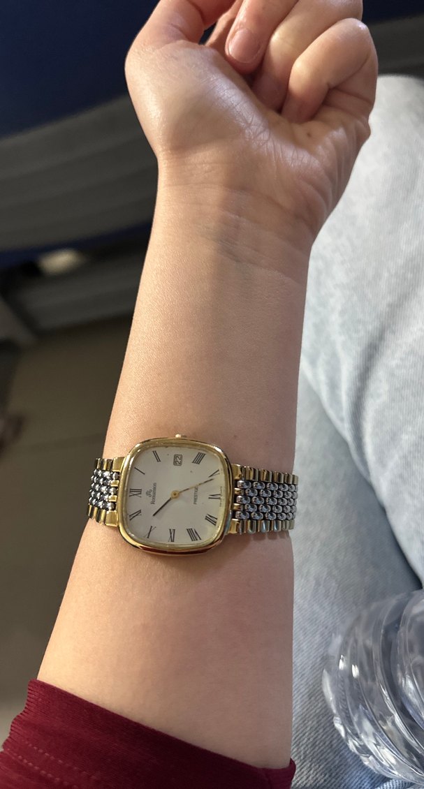 Romanson klasik kadın kol saati, parlak altın renk kasası ve tokalı iki renkli metal kayışıyla dikkat çeker. Kare kadranda Roma rakamları ve tarih göstergesi bulunur. ⌚
