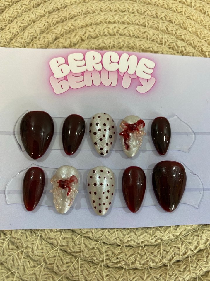 Koyu bordo renkte, inci ve puantiyeli desenlere sahip, kırmızı fiyonk detaylı takma tırnak seti. %100 el yapımıdır. 10lu olarak gönderilmektedir. Kalıcı oje ve jel ile hazırlanmaktadır. Kendi ölçünüze göre sipariş verebilirsiniz ♀️
