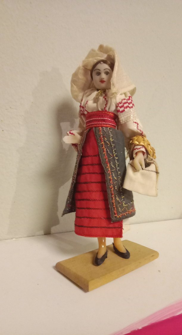ROMANYA GELENEKSEL BEBEK...Bebek, bordo elbise, gri nakışlı önlük ve başörtüsüyle geleneksel kıyafet giymektedir. Ahşap kaidede durur, küçük bej çanta taşır. 15 cm civarında