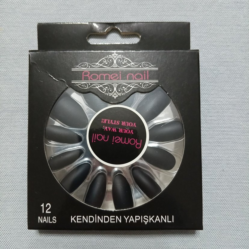 Romei Nail siyah, mat görünümlü, kendinden yapışkanlı 12 adet tırnak süsü içerir. Uygulaması kolaydır.