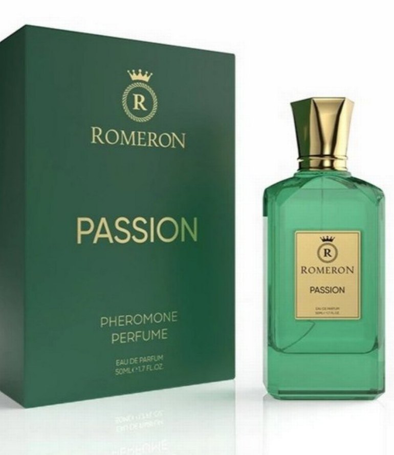 Romeron Passion, 50 ml şişede sunulan UNİSEX Afrodizyak feromonlu parfümdür. Yeşil ve altın detaylı tasarımıyla dikkat çeker.