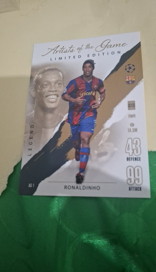 Ronaldinho'nun 99 hücum ve 43 savunma puanlarıyla altın renkli sınırlı sayıda rozeti, pop kültür athleisure tarzında. ⚽