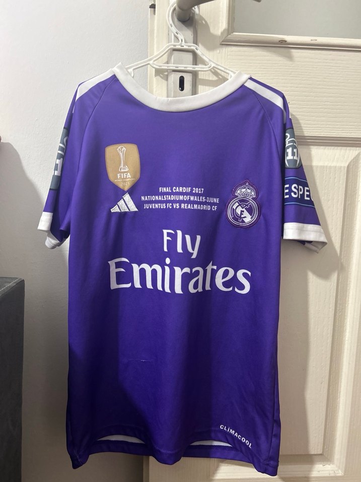Mor, kısa kollu, bisiklet yaka erkek çocuk forma. Adidas Real Madrid 2016-17 sezonu mor (3. forma). Cardiff 2017 Şampiyonlar Ligi finaline özel baskılıdır. Sırtında Ronaldo ve 7 numara bulunuyor. Hafif kullanım izleri olabilir, genel durumu iyi. Günlük kullanım veya koleksiyon için uygundur. Ölçü isteyen yazabilir. 10-11 yaşa uygundur. Makul tekliflere açıktır.