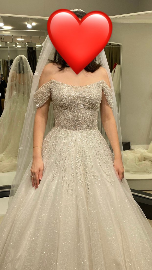 Bu beyaz gelinlik, straplez yakası ve omuzdan düşen ince askılarıyla modern klasik şıklığı uzun etekle birleştirir. Işıltılı ve şık bir tasarıma sahiptir. Platin renk olarak geçmektedir. 2 adet uzun duvak + 1 adet kısa duvak + 2 adet altın kesesi ile gönderilecektir. Kuru temizleme yapılmamıştır.
