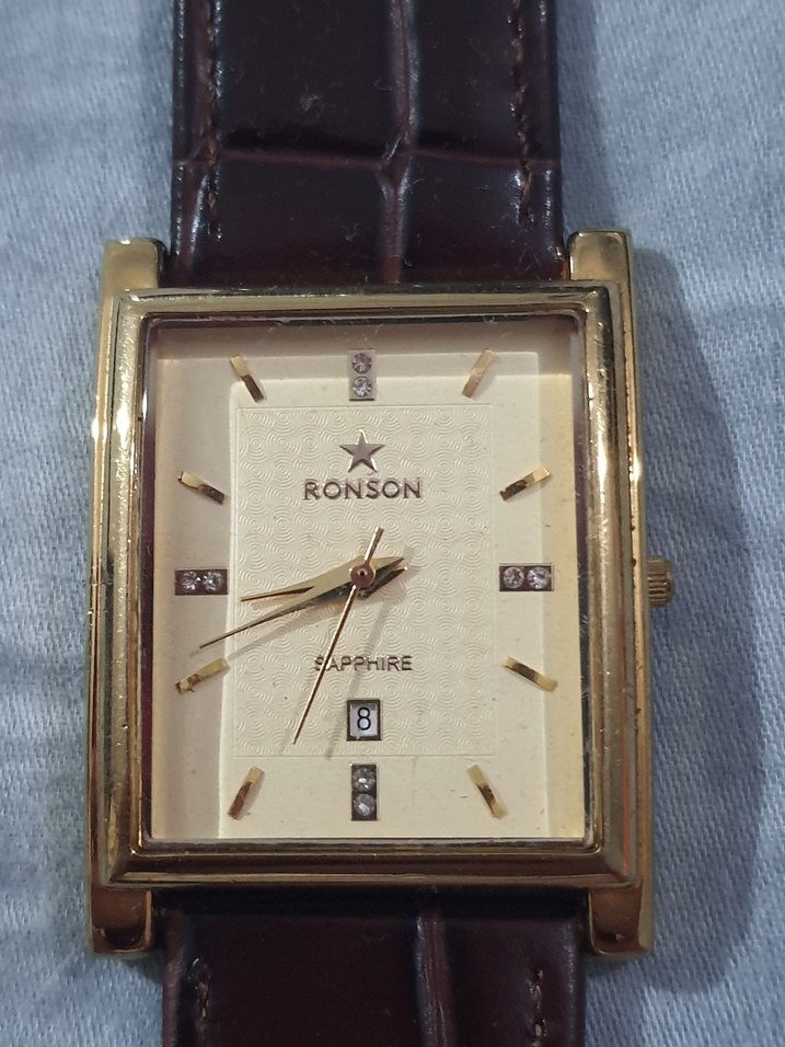1970 ler Ingiliz Ronson markalı erkek saati, parlak kahverengi deri kayış ve dikdörtgen altın renk kasa ile. Kadranda safir cam var ve 6 konumunda tarih göstergesi bulunur. ⌚çalışması müthiş. pil ve kayış yenidir.