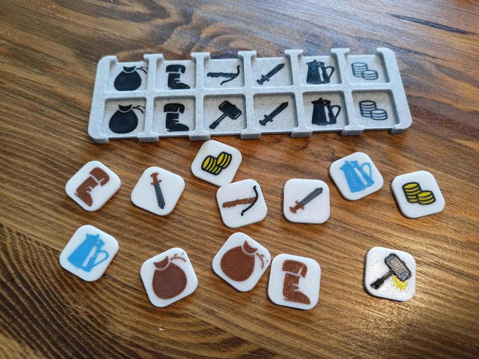 Root adlı board game için, Oyunda fraksiyonlar tarafından üretilebilen 12 renkli eşya tokenı ve bunların harita üzerinde düzenli bir biçimde depolandığı bir stanttan oluşan set. Stant üzerinde her eşyanın duracağı alan işaretlenmiş durumda. (not: Ruin eşyaları ve başlangıç eşyaları Vagabond ile eşlendiği için bunları Vagabond setine ekledim, Ruin ve başlangıç eşyalarını da ayrıca almak için mesaj atınız) Root'un orijinal parçalarını upgrade ederek görsek olarak daha etkileyici bir oyun deneyimi yaratmak için tasarlandı. Tüm ürünler yüksek kalitede termoplastik kullanılarak üretildi not: Diğer Root upgradeleri için ilanlarıma bakabilir veya mesaj fasilitesini kullanabilirsiniz. not 2: Oynamak için Root Base Game'e ihtiyacınız var, eklenti paketidir.