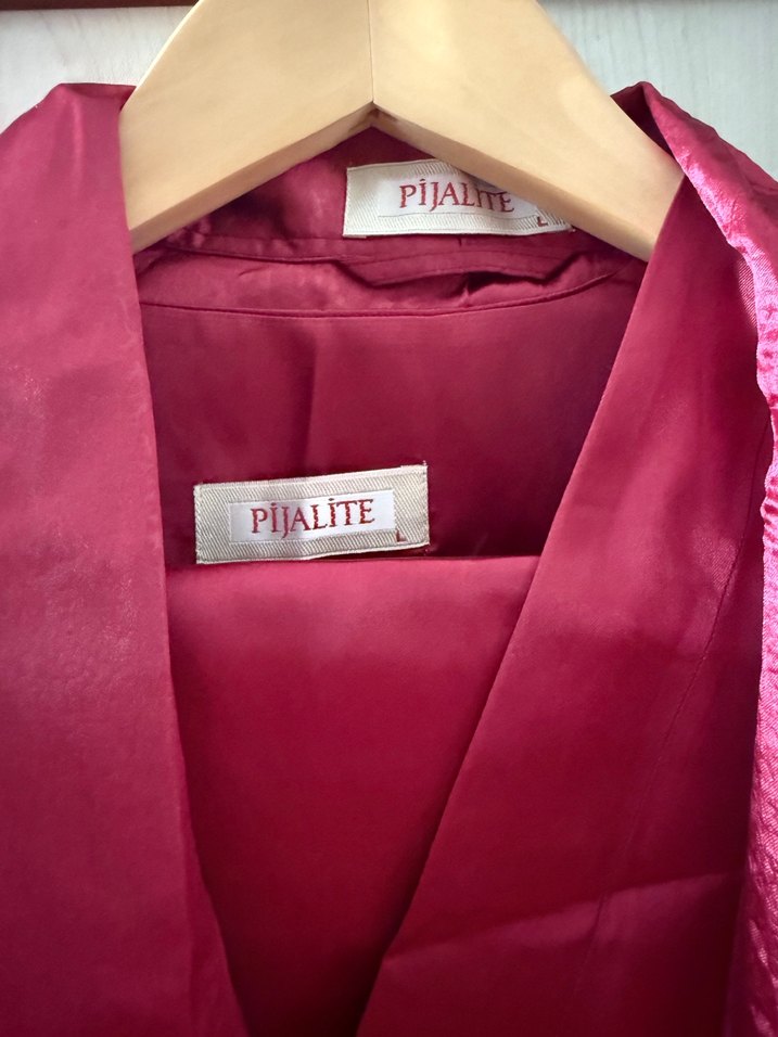 Bordo renkli, L beden erkek sabahlık uzun pijama alt üst takım üç parça saten takım.