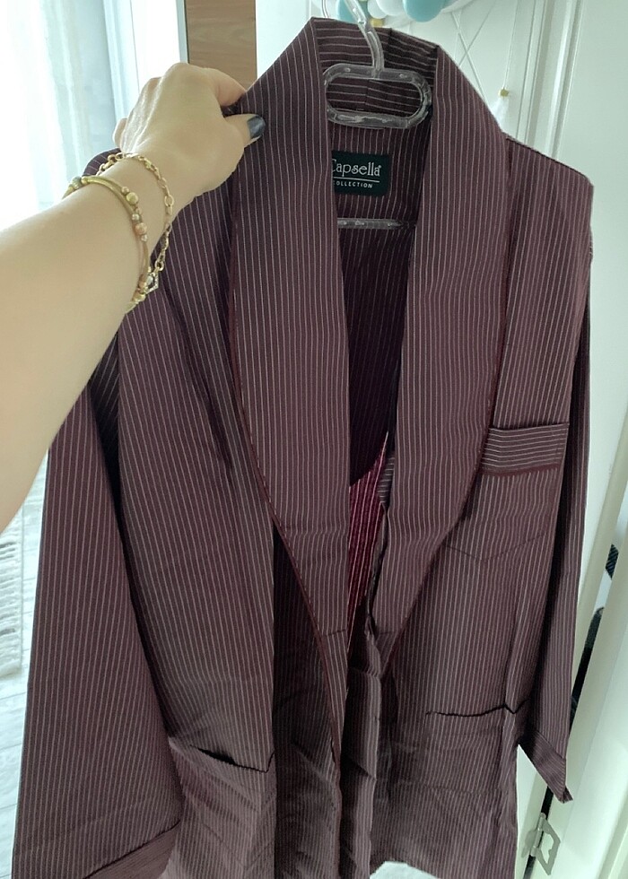 Sıfır üründür. Çeyizime alındı, hiç kullanılmadı. Çift cepli kuşaklı. Dolabımda takımı olan pijama takımı da bulunur. S-M beden uyumludur.