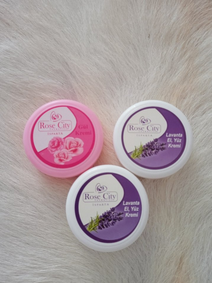 Rose City markalı lavanta ve gül kokulu el-yüz kremleri, nazik bakım sağlar. Küçük kutularda günlük kullanım için uygundur.