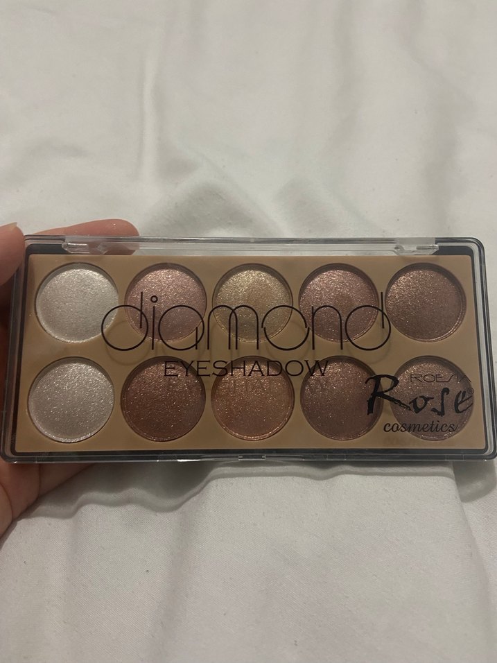 Rose Cosmetics Diamond far paleti, açık bej ve kahverengi tonlarında 10 ışıltılı renkten oluşur. Çeşitli göz makyajları için uygundur.