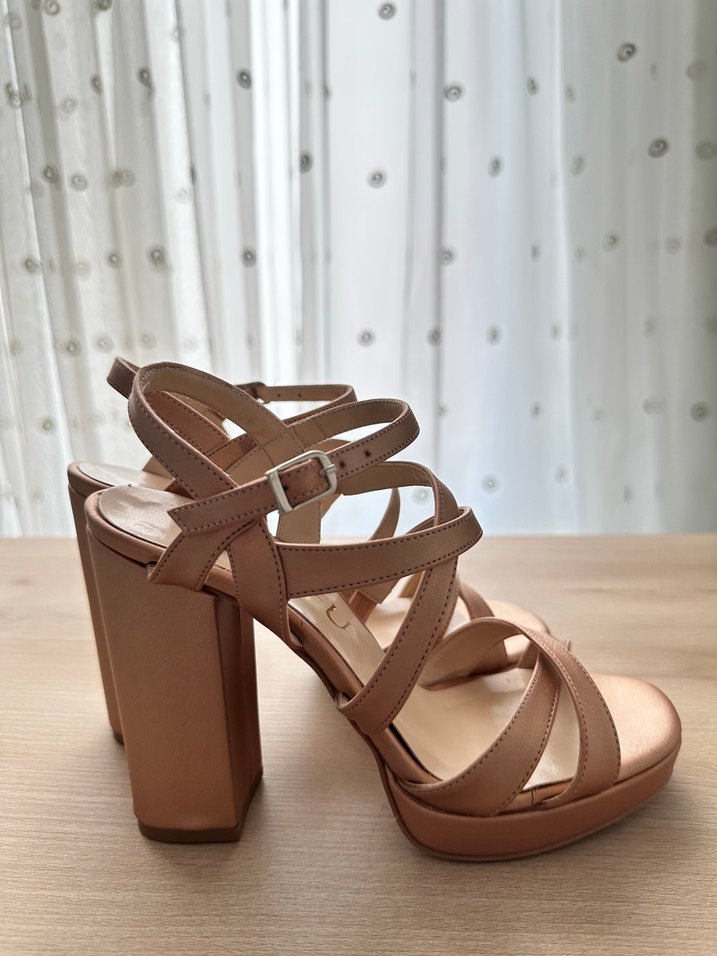 Rose Gold çapraz bantlı platform topuklu ayakkabı. Çok rahat, özel üretim yapan bir ayakkabıcıdan satın almıştım. Üniversite mezuniyetimde 1 kere giydim sadece.
