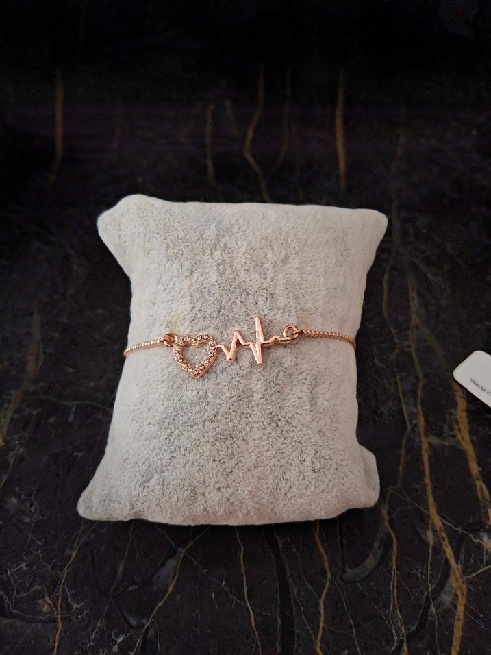 Kalp atışı ve taşlı kalp figürüyle tasarlanmış, rose gold renk zarif bir bileklik. Sevgililer Günü için ideal hediye.