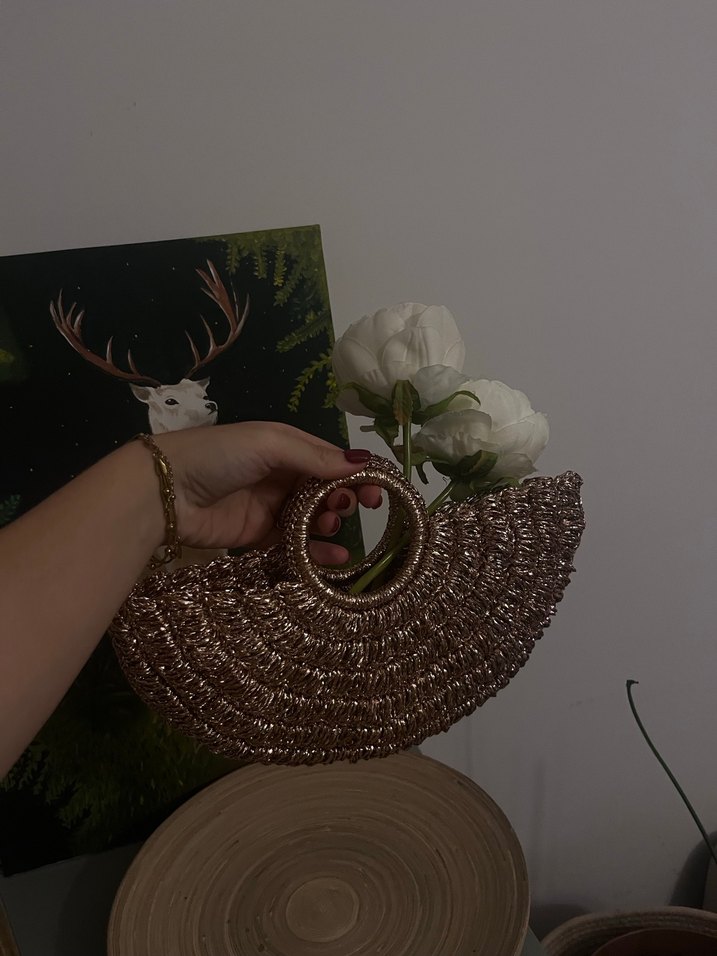 Rose gold parlak görünümlü örgü çanta, Bohem tarzını yansıtır ve günlük kullanım için uygundur.
