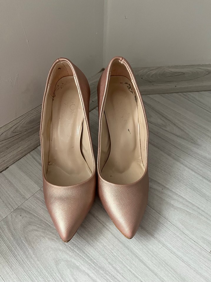 Ofis için uygun, parlak ve ipeksi dokulu Rose gold stiletto topuklu kadın ayakkabısıdır. ✨
