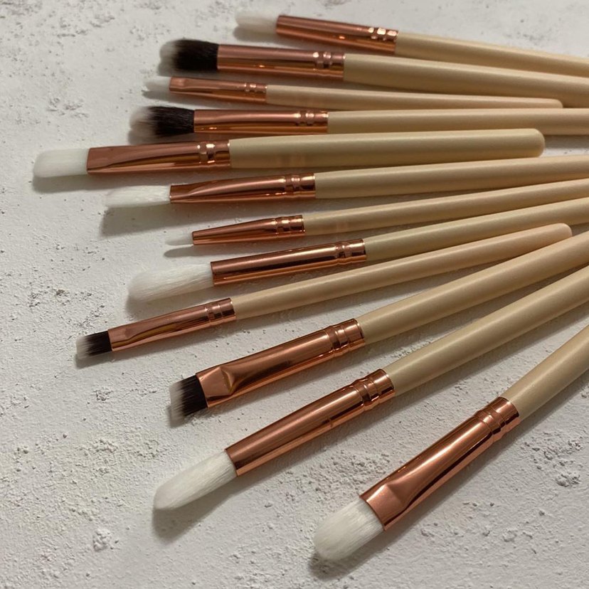 Rose Gold Pudra Göz Makyaj Seti (12 Adet). Pudra rengi ahşap saplı ve metal kısımları rose gold olan 12 adet mini göz makyaj fırçalarını her türlü göz makyajınız için rahatlıkla kullanabilirsiniz. Hiç kullanılmamış sıfır üründür. Kılları yumuşacıktır.