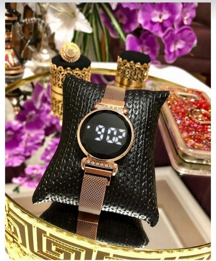 Kadınlar için rose altın tonunda, çağdaş tasarımlı ve taşlı detaylara sahip dijital saat. Sayılar net şekilde dijital ekranda görünüyor. Klasik ve gösterişli bir tarz için uygun. ⌚ #saat #kadınsaat #digitalsaat #manyetiksaat