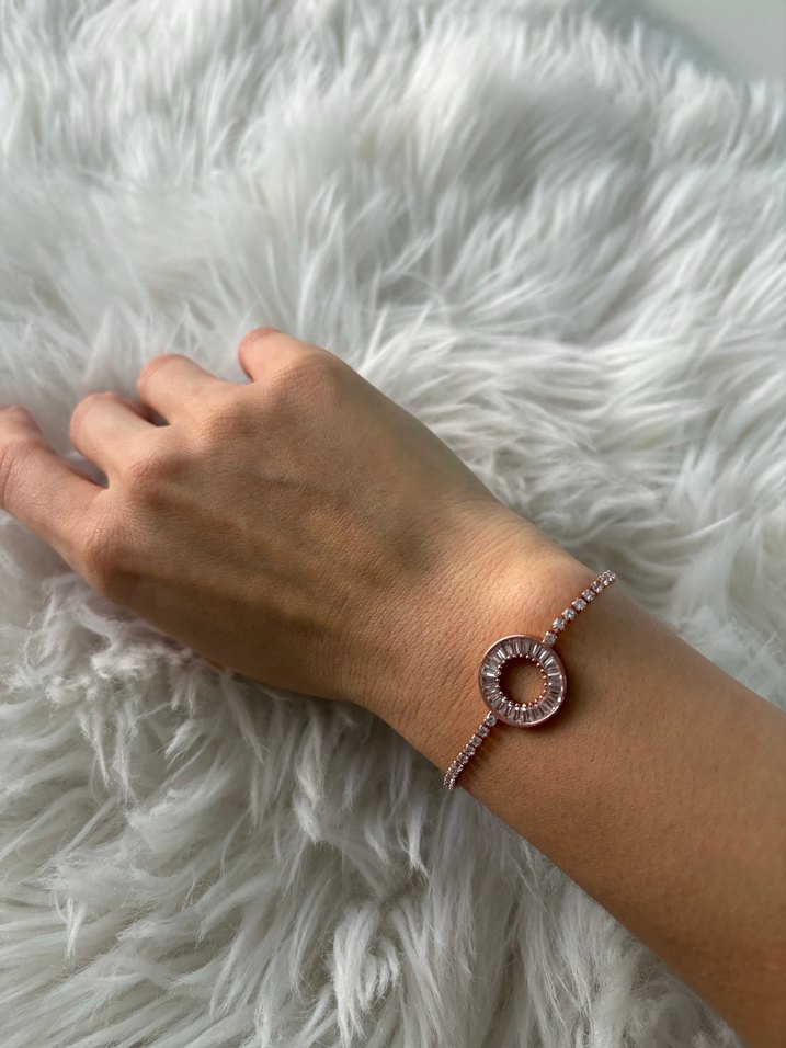 Rose renginde, minimal tasarımlı ve taş detaylara sahip bileklik. Günlük kullanıma uygun, şık ve çağdaş tarzda bir aksesuar.