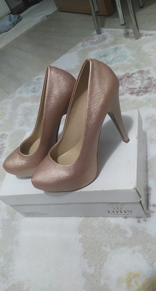 12 cm topuk rose renkli, parlak görünümlü, kauçuk malzemeden yapılmış kadın ayakkabı. Düğün ve şık etkinlikler için uygundur.