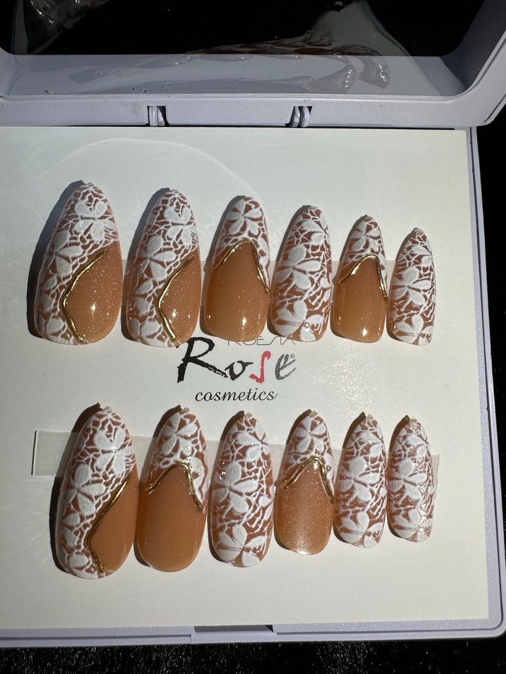 Bej renkli, beyaz dantel desenli ve hafif altın detaylı tırnak süslemeleri. Farklı tırnak boyutlarına uygun çeşitli boyutlarda mevcuttur . ( adet fiyatıdır )