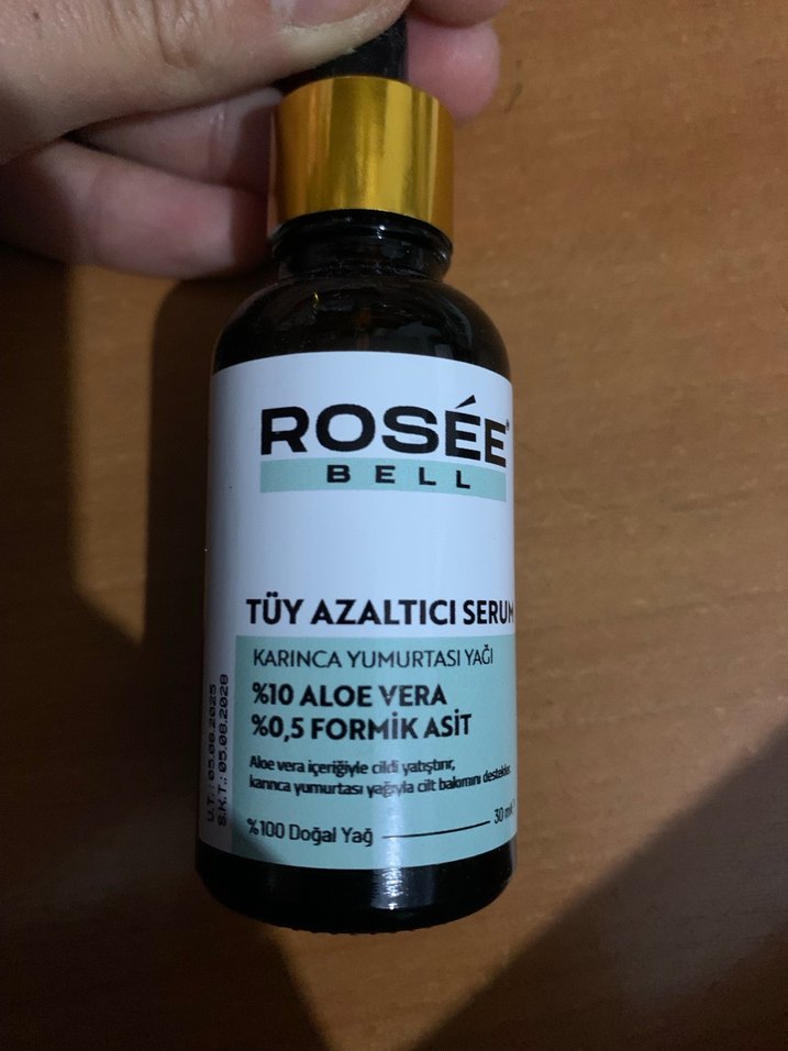 Rosée Bell tüy azaltıcı serum, %10 aloe vera, %0,5 formik asit ve karınca yumurtası yağı içeren, %100 doğal yağlarla cilt bakımına destek verir.