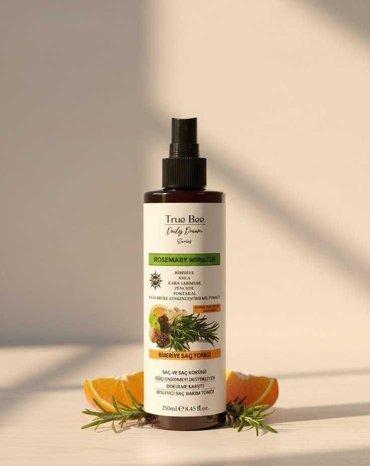 True Boo Rosemary Miracle saç toniği, doğal içeriklerle saç ve saç derisini destekler. 250 ml sprey şişede, ferahlatıcı kokuya sahip.