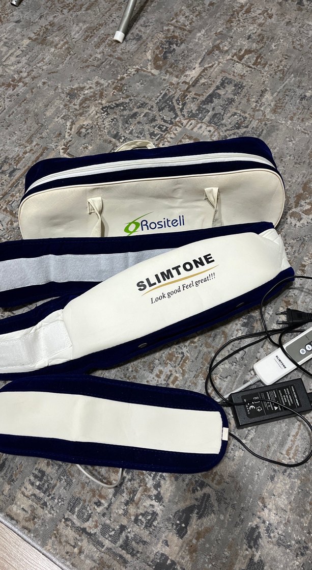Ayarlanabilir kayışlı ve uzaktan kumandalı Rositeli Slimtone kişisel bakım cihazı, beyaz ve gri renklerde, taşıma çantasıyla birlikte.