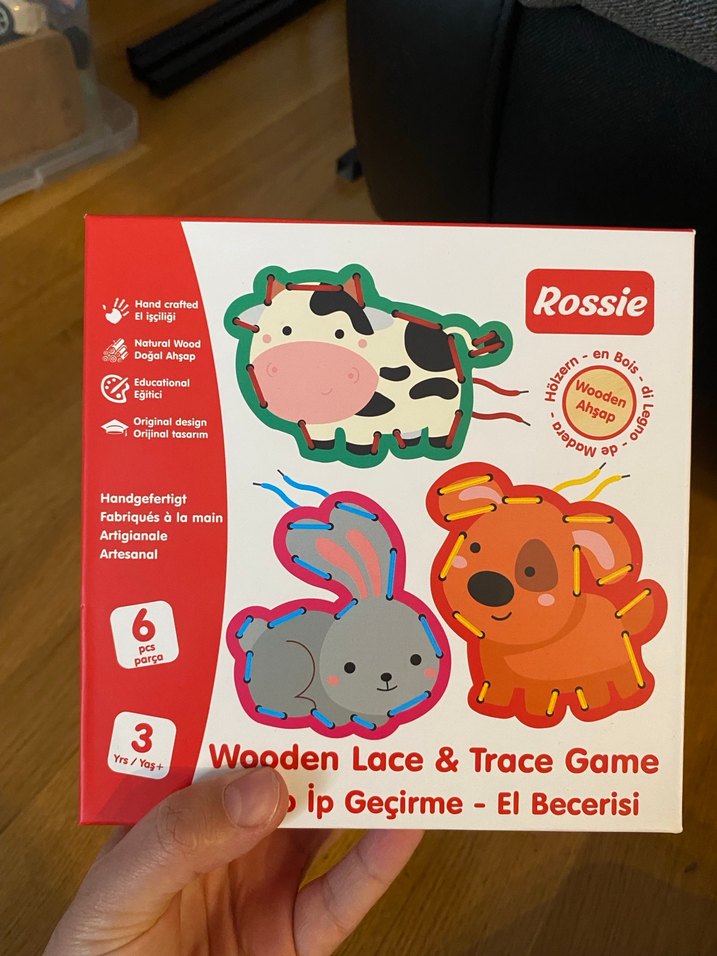 Rossie'nin renkli ahşap dantel ve iz oyunu, el becerisini geliştirir. 3 yaş ve üzeri çocuklar için 6 el yapımı hayvan figürü içerir.