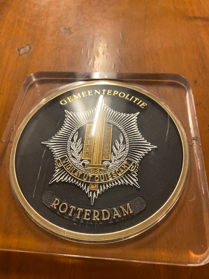 Hollanda Rotterdam Belediye Polisi (Gemeentepolitie) için özel üretim, 13*13 cm ebatlarında vintage akrilik masaüstü kağıt ağırlığı. Şeffaf blok içine gömülü metalik armada, "Vigilat ut Quiescant" (Huzur için nöbetteyiz) mottosu ile kılıç ve kanun kitabı figürleri yer alır. 1993 öncesi eski teşkilat yapısına ait, arkası yüzey koruyucu yeşil çuha kaplı, resmi ve koleksiyonluk bir objedir. #polis #hollanda #rotterdam #vintage