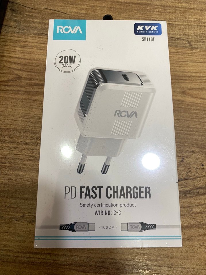 ROVA 20W hızlı şarj cihazı, USB-C - USB-C kablo ile birlikte gelir ve güvenlik sertifikasına sahiptir. Hızlı PD şarj desteği bulunur. ⚡