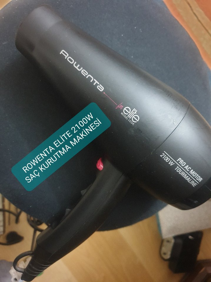 Rowenta Elite siyah saç kurutma makinesi, 2100W pro AC motor ve turmalin teknolojisi ile hızlı ve etkili kurutma sağlar. Farklı ısı ve hız ayarları bulunur.