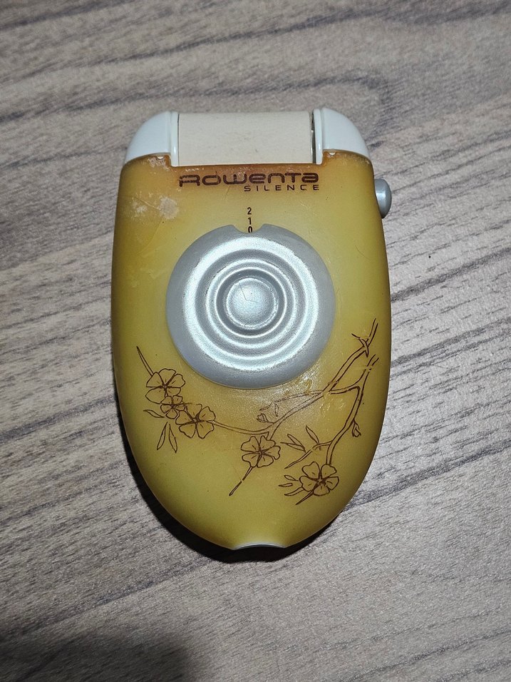 Ayarlanabilir hız ayarlarına sahip, çiçek desenli sarı Rowenta Silence epilatör. Kompakt ve kullanımı kolay. sadece cihaz ve 2 başlık ile gönderilecektir çalışır durumda