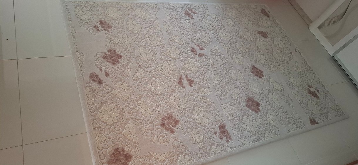 Açık bej renkte, geleneksel tarzda, kabartmalı dokusu ve yumuşak yüzeyi olan halı.