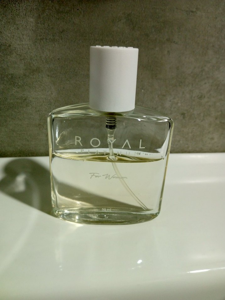 Royal kadın parfümü, 50 ml. Şeffaf cam şişe ve beyaz kapak ile sade ve zarif tasarım sunar.