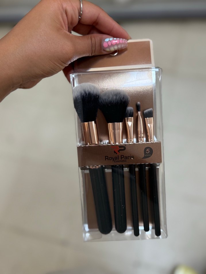 Royal Paris markalı, bej ve koyu renk saplı 5'li makyaj fırça seti, farklı makyaj uygulamaları için uygundur. ️