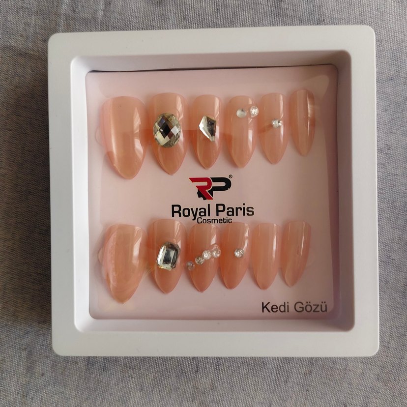Royal Paris'in bej tonlarında, kedi gözü efekti ve parlak taş detayları olan tırnak süsü seti. Zarif tırnaklar için idealdir.