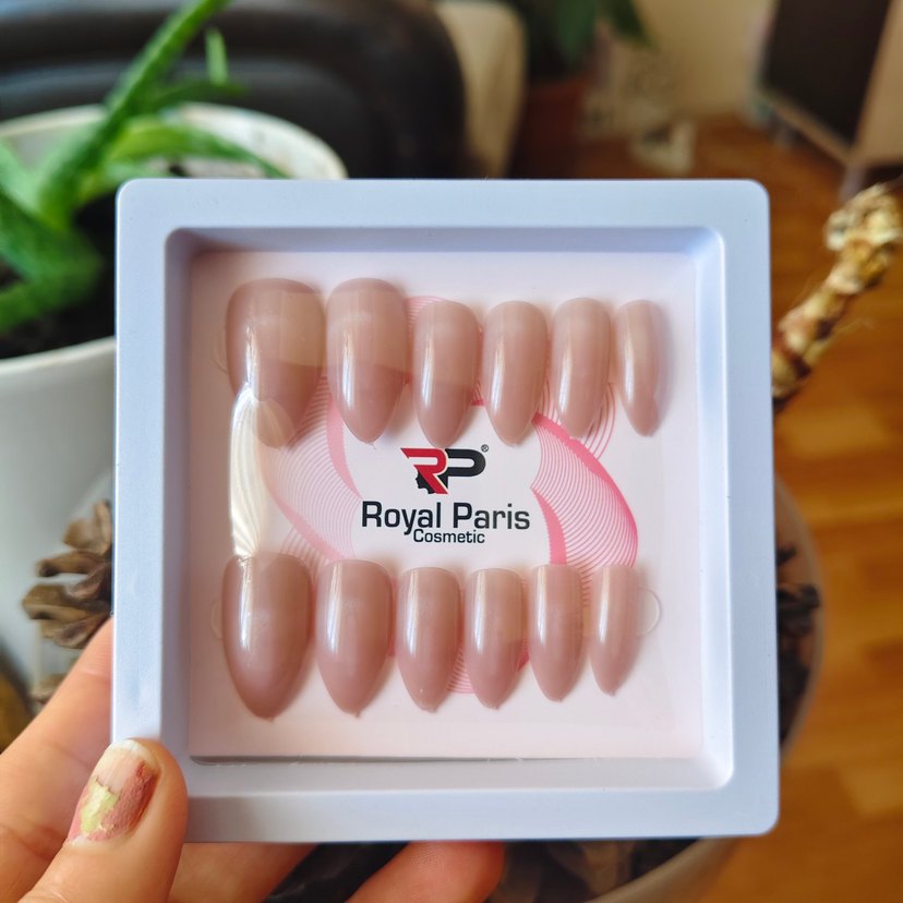 Royal Paris Cosmetic markasına ait bej renkli tırnak süslemeleri, doğal ve hafif bir görünüm sunar. Farklı boyutlarda tırnaklar için uygundur.