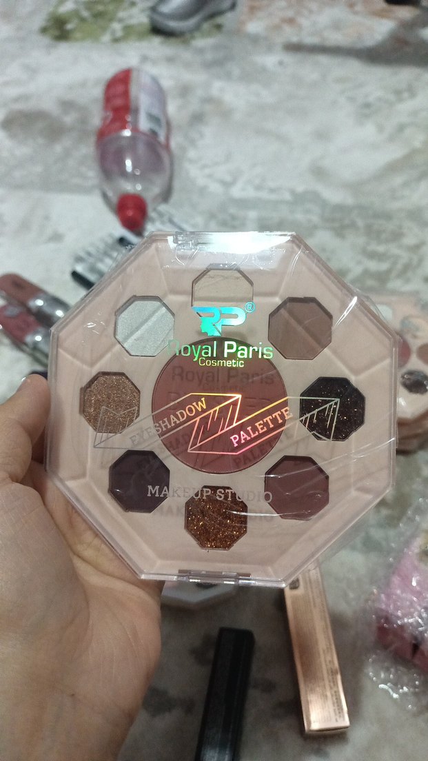 Royal Paris göz farı paleti, bej kutuda çeşitli koyu tonlar sunar. Mat ve ışıltılı dokular içerir.