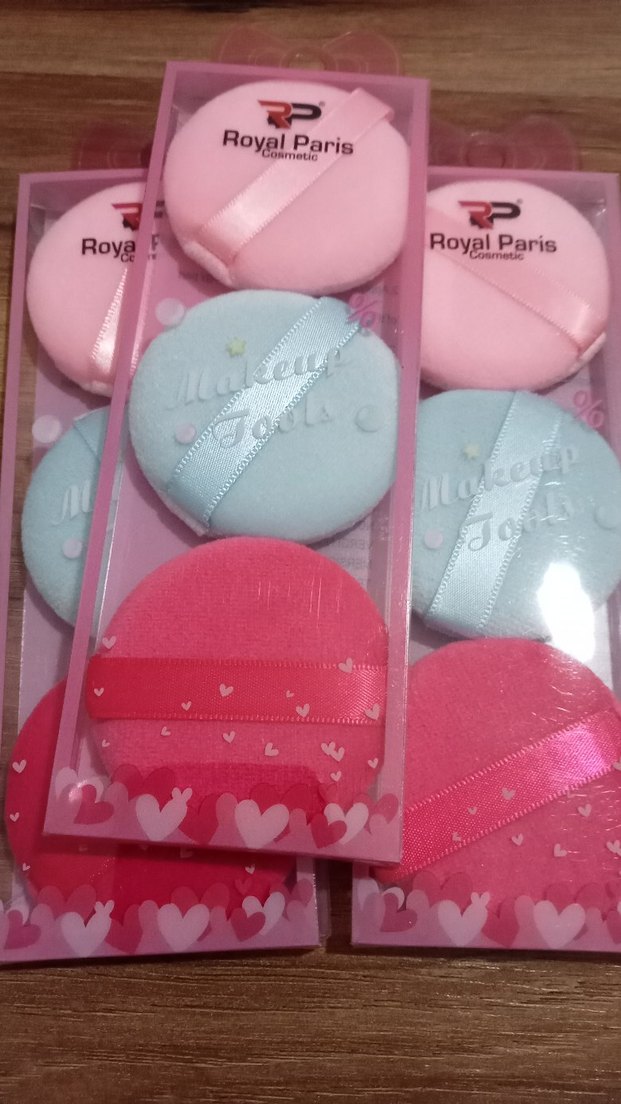 Royal Paris makyaj süngeri seti, pembe, açık mavi ve canlı pembe pastel renklerde, tutması kolay kurdeleli yumuşak süngerler içerir.
