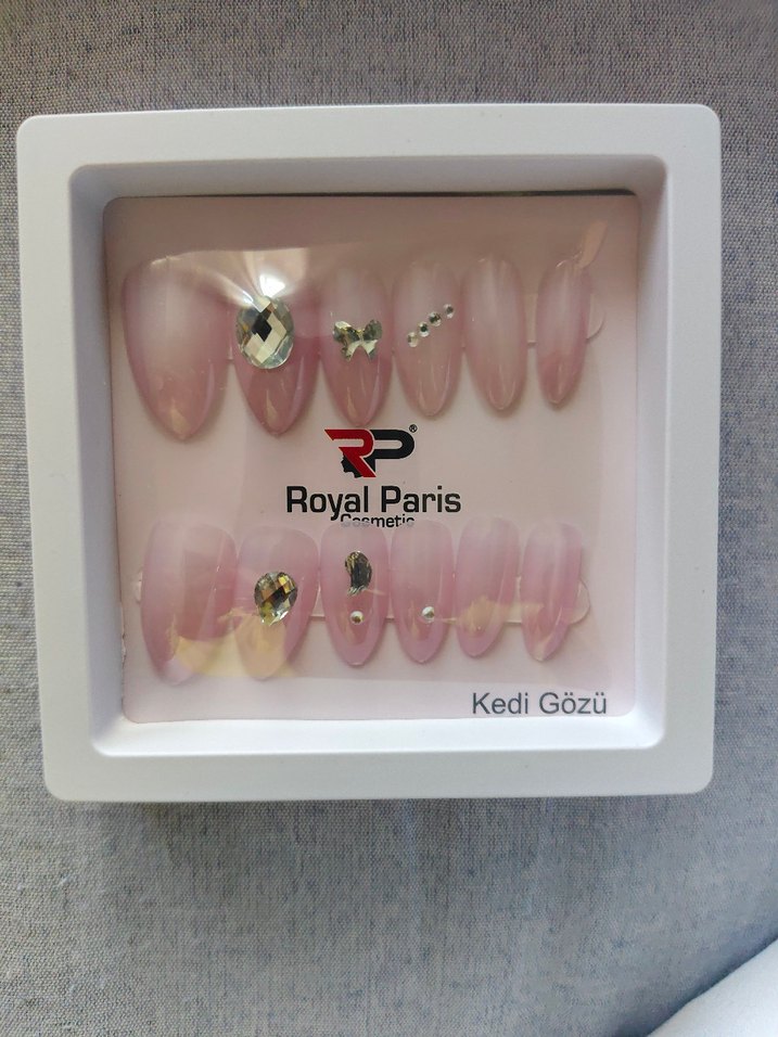 Royal Paris markalı, açık pembe kedi gözü tırnak süsleri, küçük taş ve fiyonk detaylarıyla zarif bir görünüm sunar.