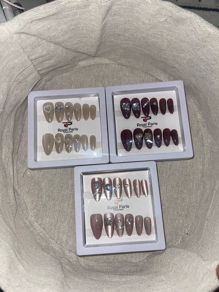 Royal Paris marka, parlak detaylı bej ve koyu tonlarda tırnak süslemeleri. Farklı boylarda tırnaklarla kolay uygulama sağlar.