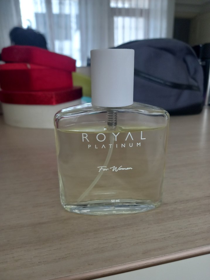 Royal Platinum kadın parfümü, 50 ml şişede beyaz kapaklı ve şeffaf tasarıma sahip, zarif bir koku sunar. çok az kullanıldı.240 numara