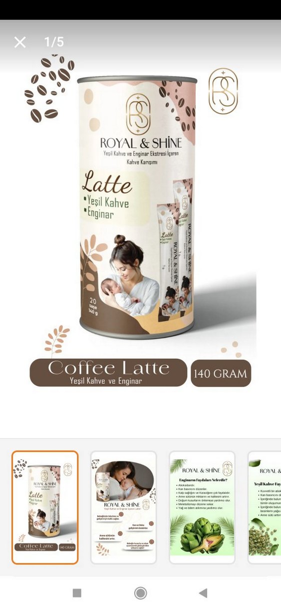 Royal & Shine Latte, 140 gram, yeşil kahve ve enginar ekstraktları içerir. Kahve sevenler için özel karışım sunar. ☕ sıfır ürün