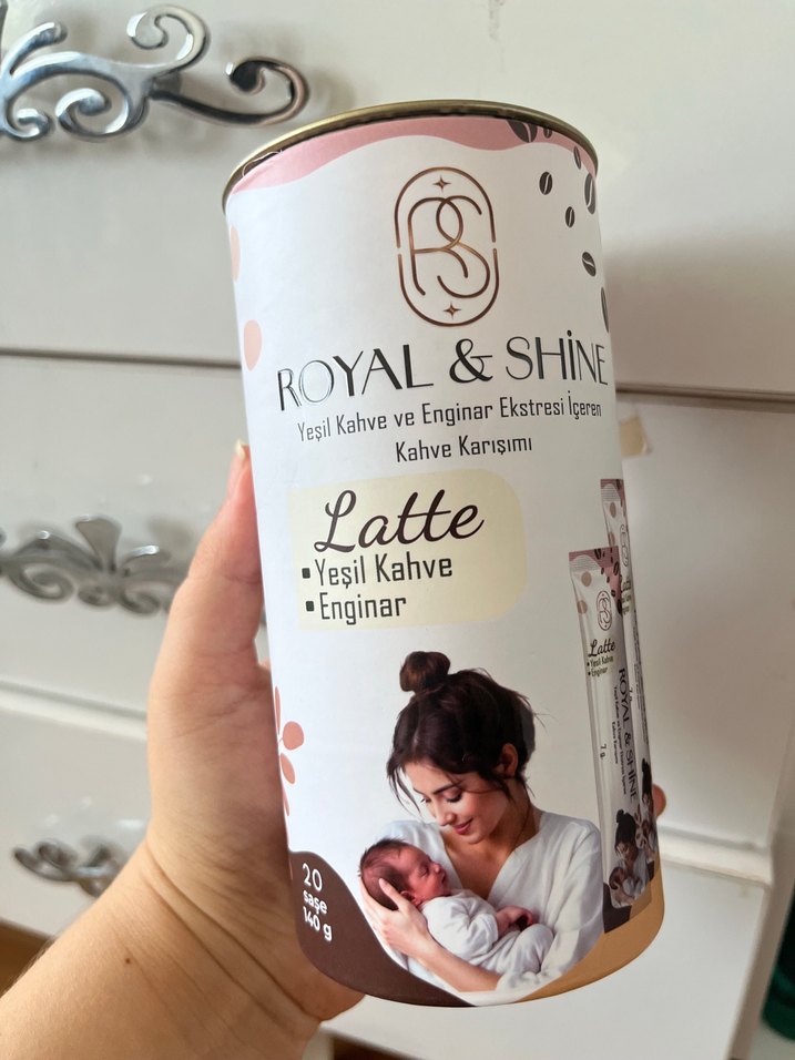 Royal & Shine Latte, yeşil kahve ve enginar ekstresi içeren kahve karışımıdır. 20 adet 144 gramlık paketler halinde sunulur. Anneliği simgeleyen görseliyle dikkat çeker. ☕