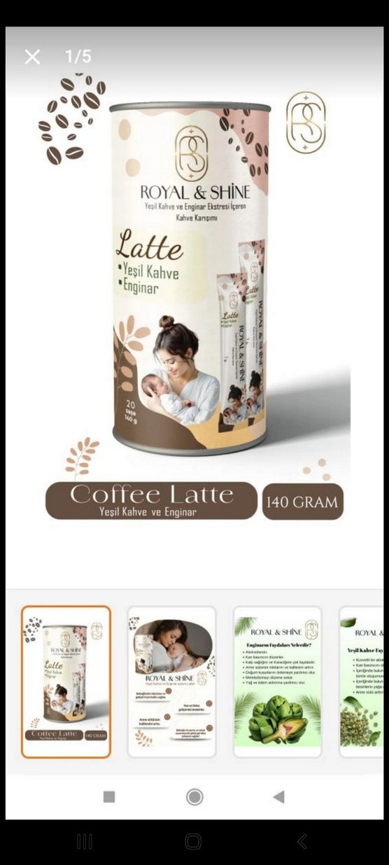 Royal & Shine Latte, yeşil kahve ve enginar özleri içeren 140g'lık ambalajda sunulur. Açık bej renkli paketle eşsiz bir kahve karışımı sağlar. ☕️